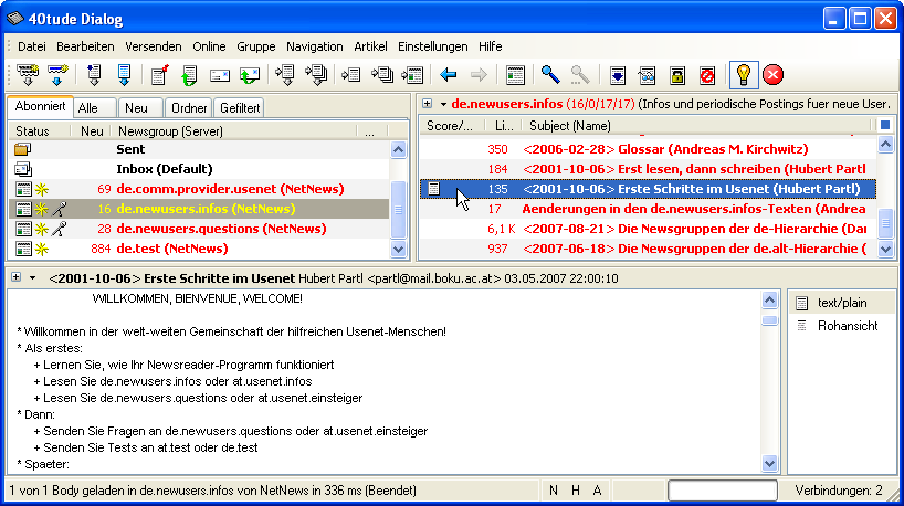 Die abonnierten Newsgruppen sind dann unter der Registerkarte Abonniert zu finden. Durch einen Doppelklick auf den Gruppennamen werden die Artikelkopfzeilen der jeweiligen Gruppe geholt.