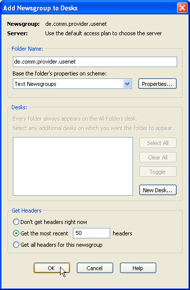 Um eine Gruppe nun zu abonnieren, markieren Sie die gewünsche Gruppe mit der Maus und klicken Sie danach auf die Schaltfläche Add Newsgroup to Desks.